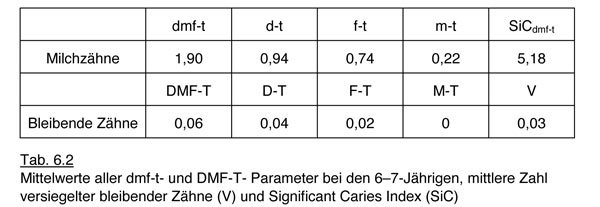 Die 6- bis 7-jährigen Kinder haben 52,7 % naturgesunde Milchzähne aufgewiesen, für die bleibenden Zähne war dies ein Wert von 96,3 %.
