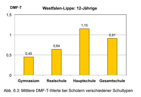 Die Abbildung 6.3 verdeutlicht die Abhängigkeit der Zahngesundheit vom sozioökonomischen Status der Kinder und Jugendlichen, die Abbildung 6.6 spiegelt u.a. die Erfolge der Gruppenprophylaxe wider – die Zahngesundheit hat sich erneut erfreulich verbessert.